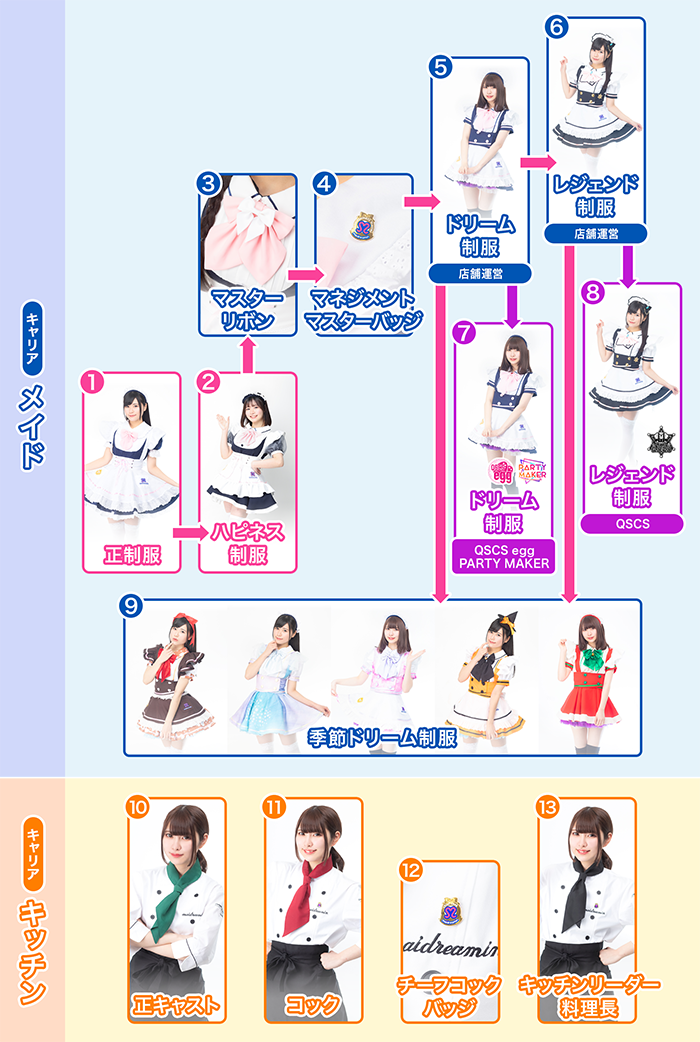 めいどりーみんのキッチンキャストは、メイドカフェでいちばん料理と飲み物が美味しいということにプライドを持ち、調理場のクリンリネスや食材仕入れ管理、提供スピード、食欲をそそる盛り付けなど店舗で提供されるお食事と料理に責任を持ちます。社員になると、品質とスピードが安定できる仕組みづくりおよび改善を行いながらプレイングマネジメントで調理場の責任を担います。