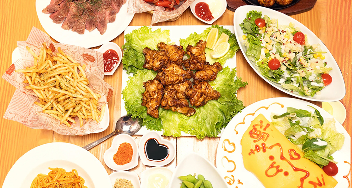 シーザーサラダ/フライドポテト/たこ焼き/ チキンウイング(4種のスパイス)/タコちゃんウィンナー/ 天元豚のステーキ/オムライスorパスタ/枝豆